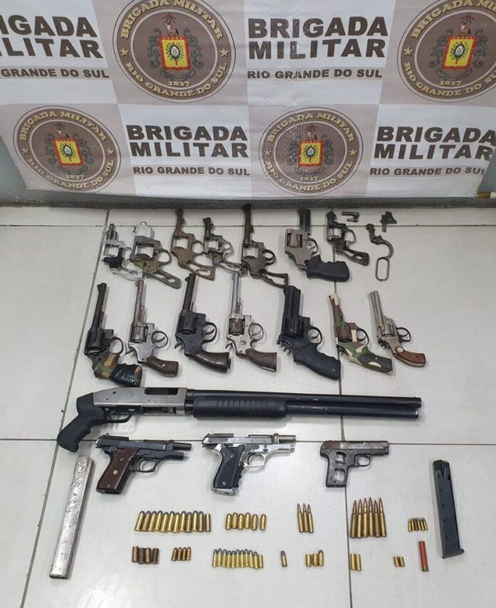 Com ela, segundo a Brigada Militar (BM), os policiais apreenderam uma espingarda calibre 12, duas pistolas calibre 380, sete revólveres calibre 38, sete carcaças de revólveres, uma carcaça de pistola calibre 765, munições intactas e deflagradas de diversos calibres, além de dois carregadores prolongados.