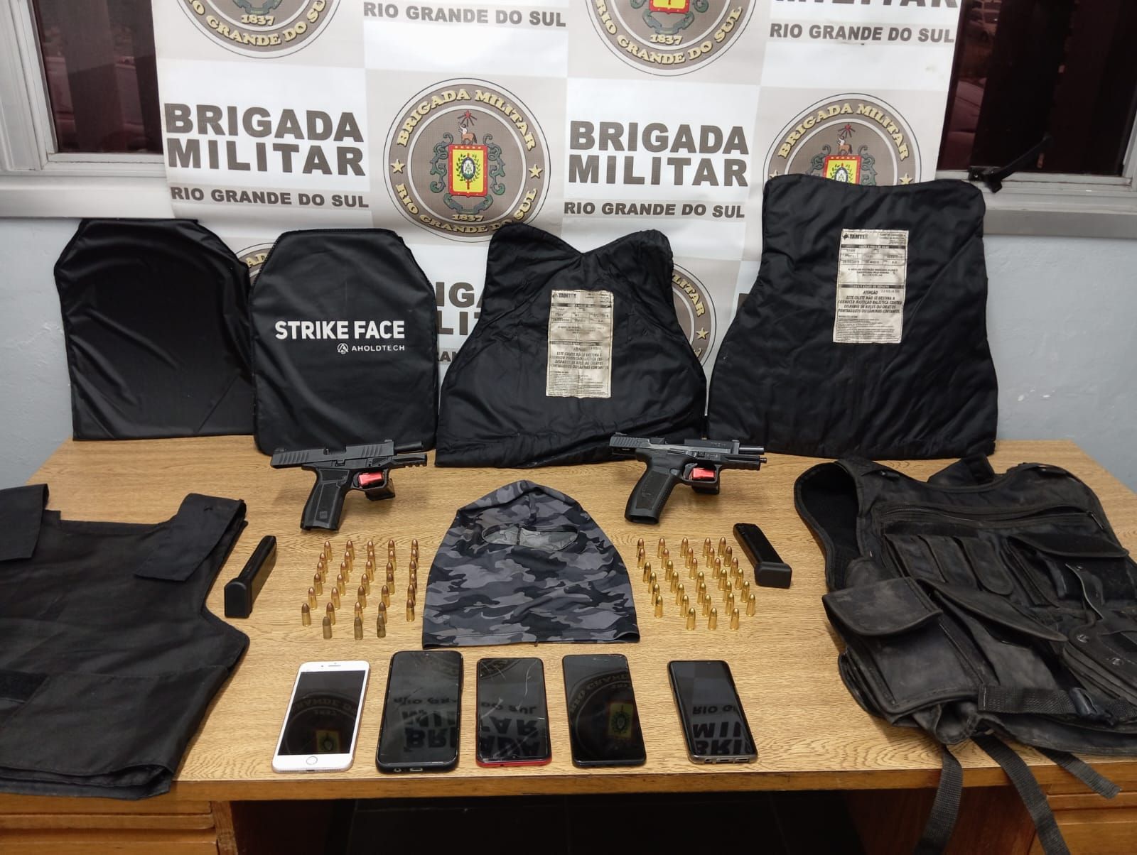 Com eles, logo após a abordagem, os PMs encontraram: duas armas de fogo calibre 9m, quatro placas de coletes balísticos e munições. Além disso, com os seis, os policiais apreenderam um carro branco.