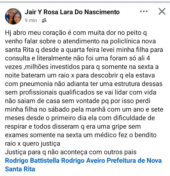 “Ela faleceu no sábado de manhã. Foi feita uma lavagem nasal, mas o líquido não saiu pelo outro lado do nariz. Dali em diante ela só foi piorando, e a gente acabou perdendo ela no sábado por causa de uma imprudência deles — de não terem feito um exame já na quarta e de terem feito uma lavagem nasal errada, que provavelmente foi parar no pulmão.”contou o pai, abalado.