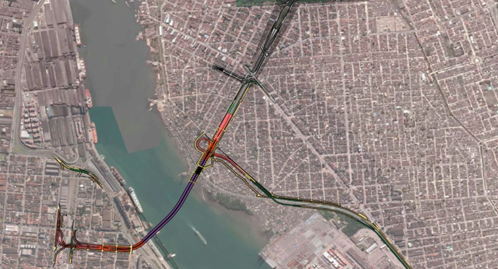 Conforme o projeto, o túnel submerso terá 1,5km com 870 metros embaixo d’água. O projeto prevê seis faixas de rolamento, ciclovia, passagens de pedestres e espaço para VLT.