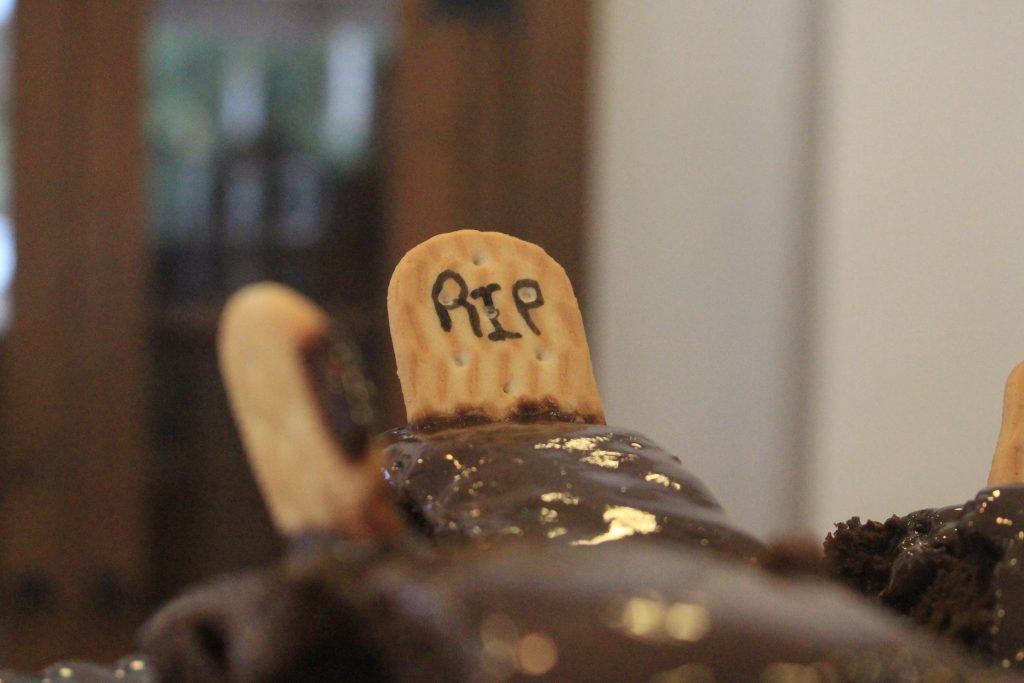 “Temos bolos com lápides ou dentaduras como preferirem. Pessoal está se divertindo um monte. Todo mundo que tirar foto com a gente”.