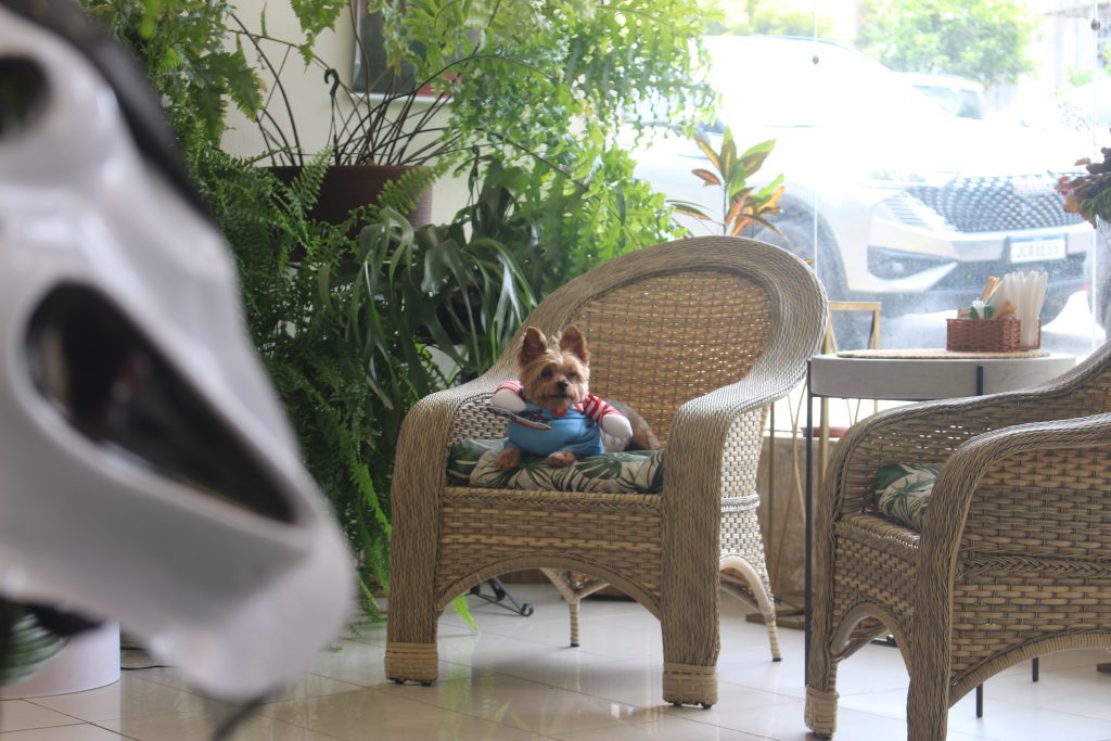 E nem os pets ficaram de fora do clima assustador. O Jimmy, um cachorrinho Shih Tzu e mascote do local, apareceu vestido de Chucky, o boneco assassino (mas aqui, ele “mata” só de fofura). Deitado em uma das poltronas, ele virou atração entre os visitantes que aproveitam o ambiente para tirar fotos e curtir o café temático.