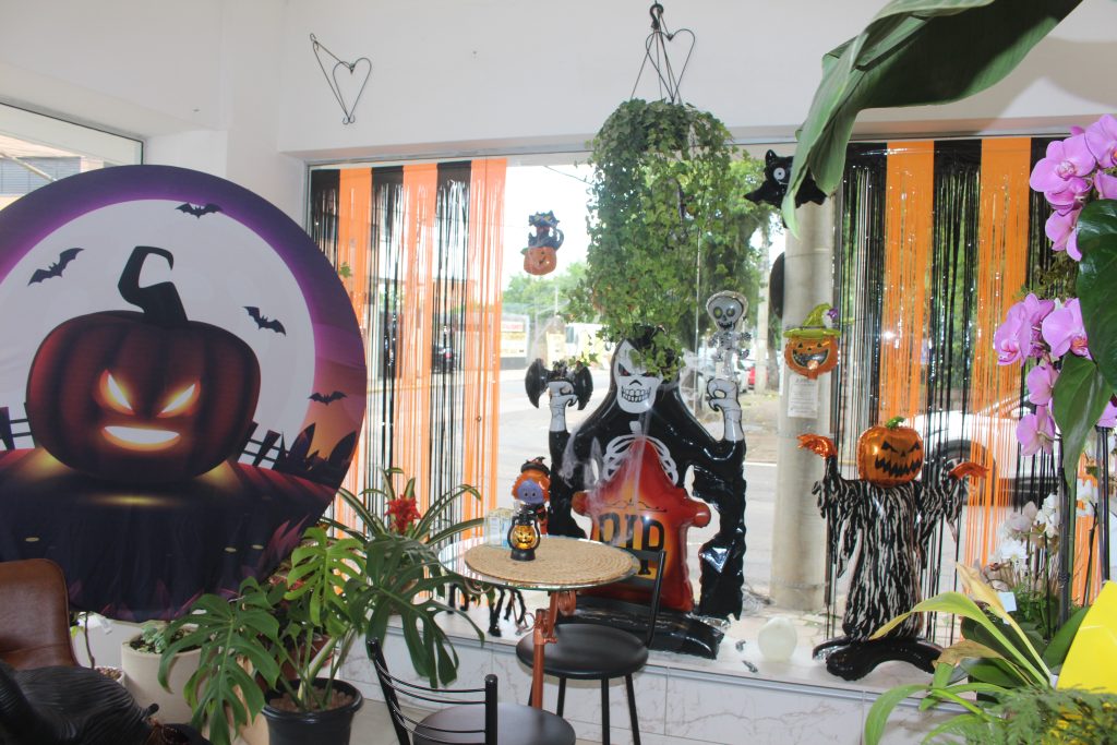 As proprietárias e funcionária decidiram entrar de vez no espírito do Dia das Bruxas. Mariane Vasques, dona do café e da floricultura contou à Agência GBC que a decoração é pensada para divertir os clientes:
