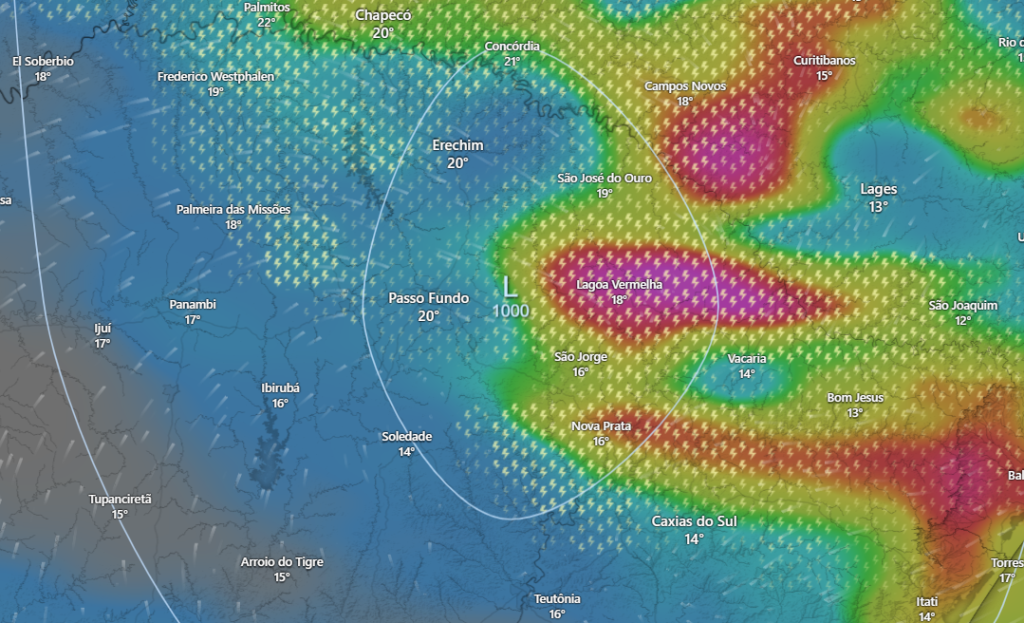 Conforme os dados meteorológicos, o ciclone começa a se formar totalmente por volta das 22h de sexta-feira (7), sobre cidades do Norte do Rio Grande do Sul, como Marau, Serafina Corrêa, Nova Prata e Passo Fundo. As áreas mais afetadas devem ser Lagoa Vermelha e Coxilha Grande, que podem registrar ventos mais fortes e maiores transtornos.