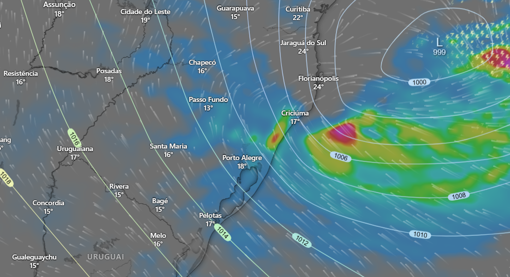 Na madrugada de sábado (8), o fenômeno começa a perder força, seguindo seu caminho em direção a Santa Catarina e ao Oceano Atlântico. Segundo o Windy, a partir das 9h de sábado o ciclone já deixa o continente, diminuindo gradualmente sua intensidade.
