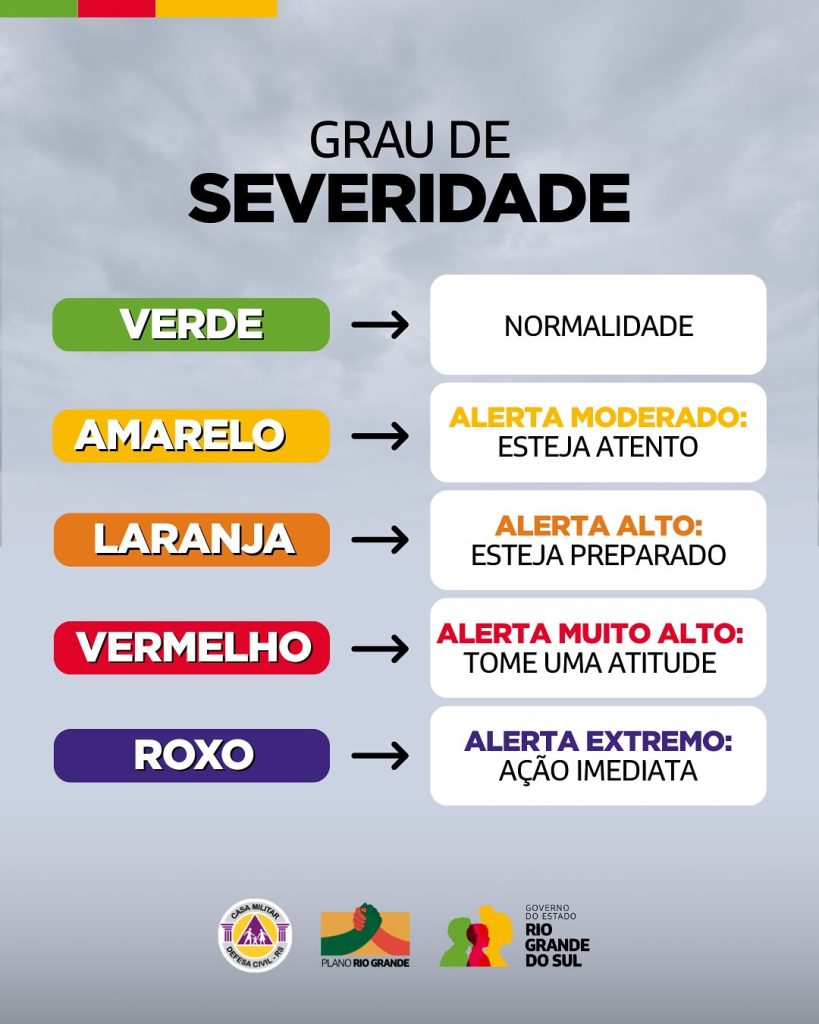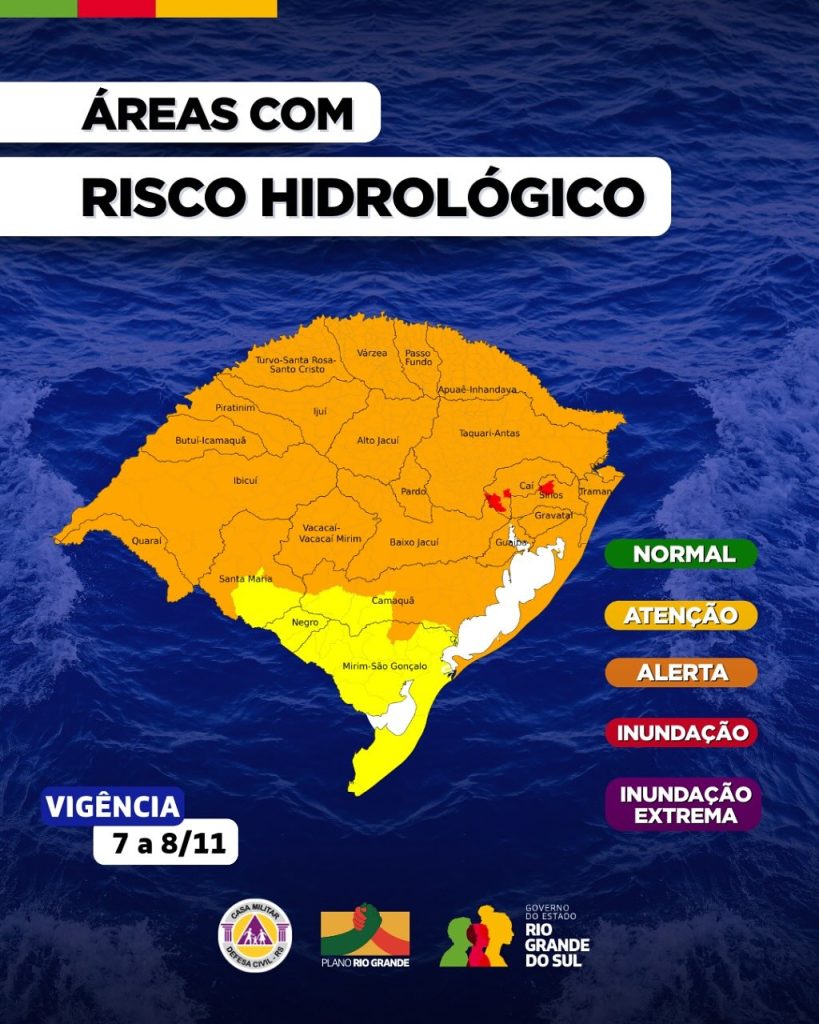 A Defesa Civil do Rio Grande do Sul emitiu um alerta hidrológico nesta quarta-feira (5) em razão das chuvas intensas previstas para o estado. O aviso hidrológico, válido a partir da próxima sexta-feira (7) e sábado (8), indica condição de atenção e alerta para diversas regiões, com risco de cheias em rios e arroios, além de alagamentos em áreas urbanas. Veja o mapa abaixo.