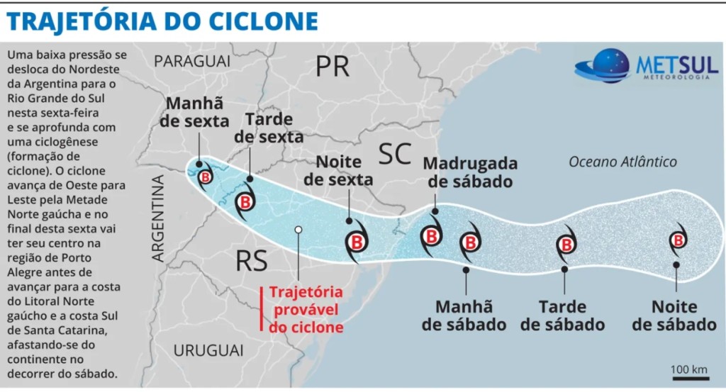 O Rio Grande do Sul e outras regiões do Sul do Brasil estão em alerta para a formação de um ciclone extratropical entre esta sexta-feira (7) e sábado (8). O fenômeno pode provocar chuvas intensas, tempestades com granizo e ventos extremamente fortes, com rajadas que podem ultrapassar os 100 km/h em diversas cidades.