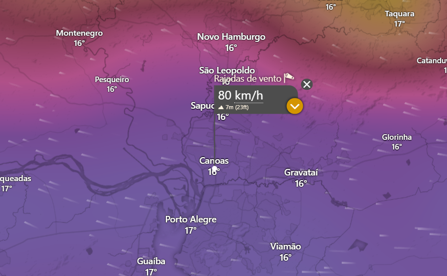 Inicialmente, os modelos indicavam rajadas acima dos 100 km/h em Canoas. Agora, com a nova atualização, o pico dos ventos deve ocorrer por volta das 21h desta sexta-feira, com velocidades que podem chegar aos 80 km/h.