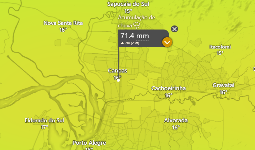 Enquanto o vento tende a perder força, a chuva deve aumentar. O Windy indica agora acumulados de 71 milímetros entre sexta e sábado (8), um volume considerado bastante elevado. Essa condição aumenta o risco de alagamentos em áreas mais baixas ou em locais com histórico de problemas com drenagem.