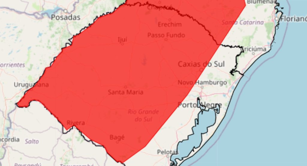 Além do Rio Grande do Sul, o alerta atinge áreas de Santa Catarina e Paraná, o que indica um sistema amplo e de grande alcance.