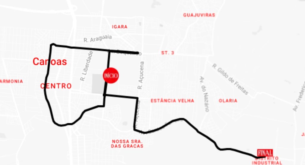 A Caravana começa no bairro Marechal Rondon, passa pela Av. Boqueirão (Guajuviras), Av. Rio Grande do Sul (Mathias Velho), cruza pelas ruas Porto Alegre, Doutor Barcelos, Av. inconfidência (Centro) Av. Sezefredo Azambuja Vieira, Rua Açucena, Av. Santos Ferreira, Av. das Indústrias.