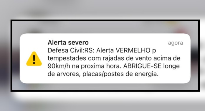 No aviso enviado aos celulares, a Defesa Civil informa a previsão de rajadas de vento acima de 90 km/h, associadas a um cenário de temporal com alto potencial de risco.