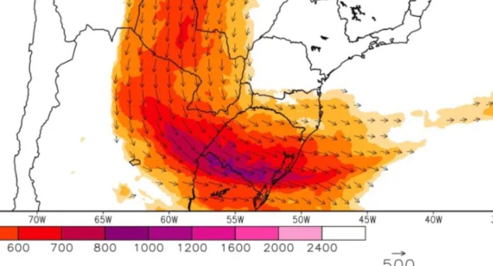 A MetSul Meteorologia alerta que o rio atmosférico ganhará força neste sábado (27) no Rio Grande do Sul. Ele poderá provocar chuva forte e intensa com altos volumes em pouco tempo.