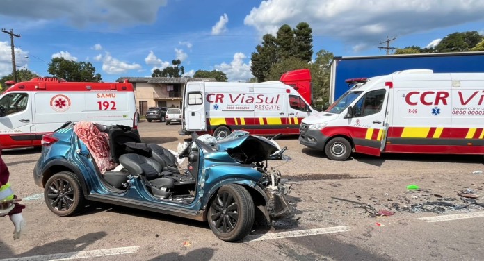 A colisão frontal ocorreu no km 286 da rodovia e envolveu um Nissan Kicks, com placas de Viamão, e uma carreta Volvo, de Fontoura Xavier. Com o impacto, os quatro ocupantes do automóvel destruído ficaram presos às ferragens.