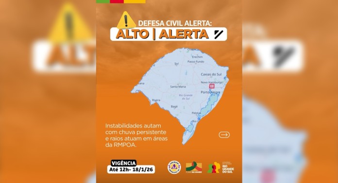 O alerta é válido até as 12h do dia 18 de janeiro e aponta condição de ALERTA para instabilidades que atuam em áreas da Região Metropolitana de Porto Alegre. Nessas áreas, há risco alto de alagamento, com atuação de chuva persistente e raios.