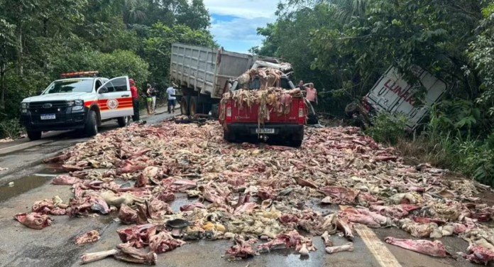 Após a batida, um dos caminhões teve a carroceria danificada e acabou derramando toda a carga de carne na pista. As imagens mostram diversos pedaços do produto espalhados pelo asfalto, dificultando ainda mais a circulação de veículos.