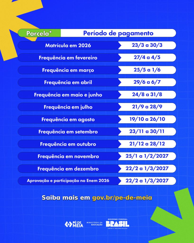 Além disso, outra alteração relevante no calendário pé-de-meia 2026 envolve o prazo de matrícula. Agora, o limite de até dois meses após o início das aulas passa a ser exigido apenas para o recebimento da parcela de matrícula.