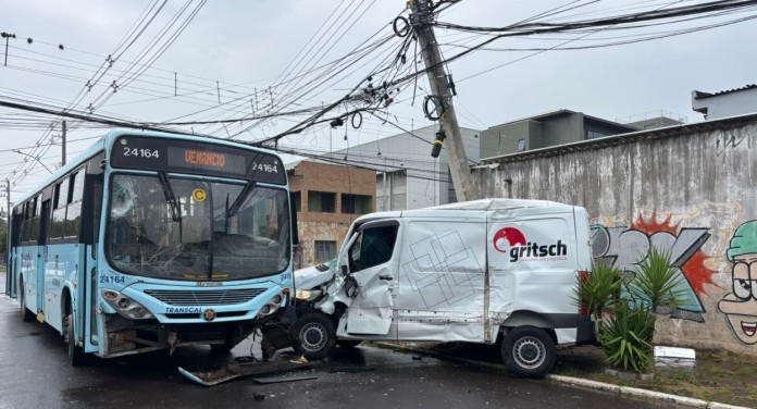 Um acidente de trânsito em Canoas deixou cinco pessoas feridas na tarde desta terça-feira (24), no bairro Niterói. A colisão envolveu um ônibus da empresa Transcal e um veículo de entrega de encomendas no cruzamento da rua Lajeado com a avenida Marechal Rondon.
