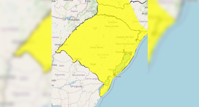 De acordo com o órgão federal, o alerta começa às 00h01 desta quinta-feira (5) e segue até 23h59 de sexta-feira (6), abrangendo todo o território do Rio Grande do Sul.