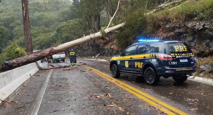 Ainda, conforme a PRF, a rodovia deverá seguir bloqueada até às 18h. Equipes trabalham no local para a remoção do eucalipto. Além disso, os condutores precisam ficar atentos: devido a chuva que caiu na região,