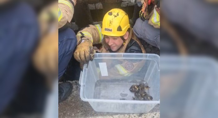 Os filhotes de marreca estavam presos em um bueiro às margens da rodovia, enquanto a mãe permanecia nas proximidades, visivelmente agitada. Com técnicas apropriadas, os bombeiros conseguiram acessar o local e retirar, um a um, os pequenos animais.