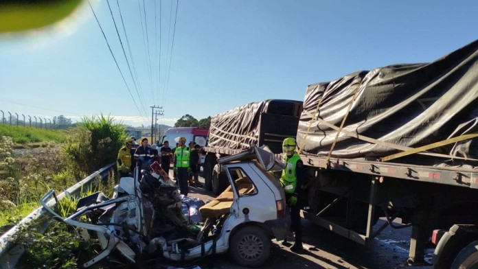 De acordo com informações da Polícia Militar Rodoviária, houve uma colisão frontal entre o Fiat Uno e o caminhão. Com o impacto, o veículo ficou completamente destruído.