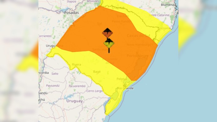 Além do nível mais grave, há também um alerta amarelo cobrindo todo o Rio Grande do Sul.
