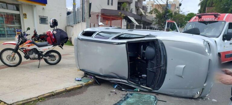 Carro fica destruído após motorista perder controle e capotar