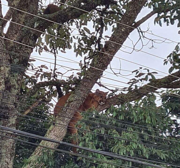 Onça-parda é salva por equipes de resgate após 11 horas no alto de árvore